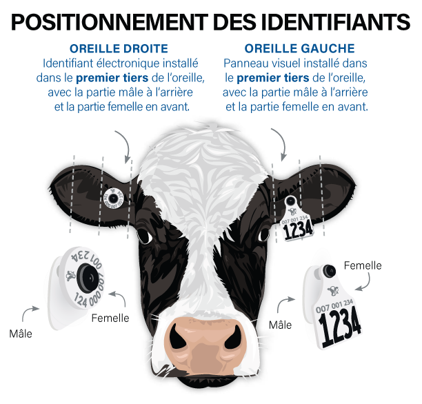 L’objectif ultime de TracéLaitier est que tous les animaux laitiers aient une double identification. Installer un identifiant sur vos veaux à la naissance est un moyen efficace d’identifier un animal de façon permanente avec un numéro unique. Les jeux de deux identifiants comprennent un identifiant RFID électronique, idéalement apposé sur l’oreille droite de l’animal, et un panneau visuel à placer sur l’oreille gauche. Cette façon de faire permet de veiller à ce que, si un animal perd un identifiant, il demeure possible de l’identifier avec l’autre, et permet également de travailler avec la technologie RFID et des lecteurs d’identifiants électroniques.
