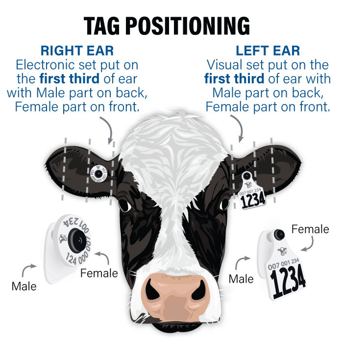 The ultimate goal of DairyTrace is double tagging of all dairy animals. Tagging your calves at birth provides an efficient way to permanently identify the animal with a unique number. Dual tag sets are comprised of an RFID electronic tag, ideally placed in the right ear of the animal, and a secondary panel tag placed in the left ear. This ensures that if an animal loses one tag, they can still be identified with the other, as well as having the capability to work with RFID technology and electronic tag readers.